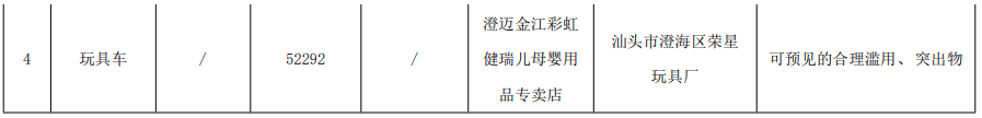 本次抽查发现涉及安全性指标的项目有4批次不符合标准要求,涉及的不合格项目为:不适合36个月以下儿童使用的玩具、可预见的合理滥用、小零件、正常使用、小球、孔、间隙、机械装置的可触及性、弹射玩具、突出物。有3批次产品不符合使用性要求,涉及的不合格项目为:玩具警告标识。