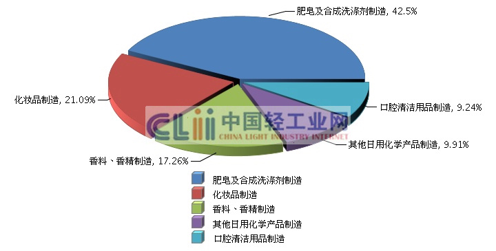 分行业看,肥皂及合成洗涤剂制造完成累计利润总额(占42.5%,同比下降19.99%;化妆品制造完成累计利润总额占21.09%,同比增长27.67%;香料、香精制造完成累计利润总额占17.26%,同比增长13.53%;口腔清洁用品制造完成累计利润总额占9.24%,同比增长26.99%(见图3.5、图3.6)。