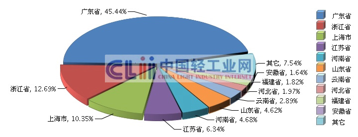 2013年1~7月全国日化行业利润较高的产区主要集中在主要集中在广东省、浙江省、上海市、江苏省、河南省、山东省、云南省、河北省、福建省、安徽省等地区10个地区完成利润总额占全国的92.46%(见图3.7)。