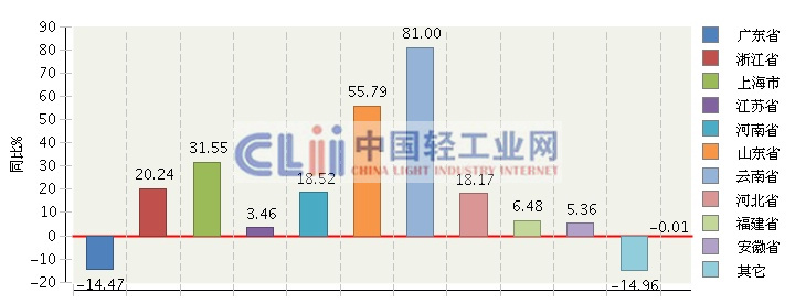2013年1~7月全国日化行业利润同比增长较快的地区是云南、山东、上海、浙江等地区,完成利润占比最大的广东省同比下降14.47%。