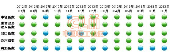 其中:主营业务收入指数92.12,出口景气指数96.66,资产景气指数103.79,利润景气指数88.35,除利润景气指数处于渐冷区间,其他指数均位于稳定区间,参见图1-2。