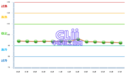 家具行业主营业务收入景气指数已连续5个月呈现出微幅回落,缓步向“稳定”区间的底限边缘线靠近,7月比6月下降了0.55个百分点(图1)。