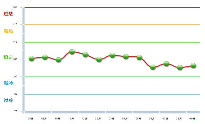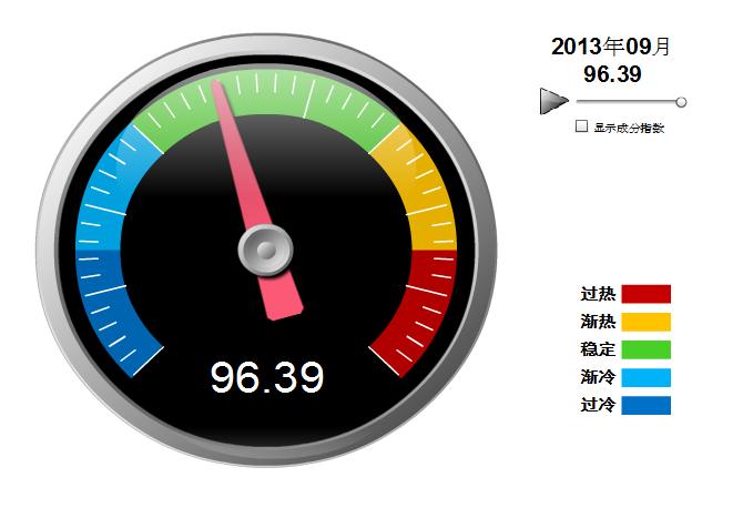 2013年9月中轻钟表景气指数为96.39,95.27,与去年同期相比下降4.86,环比下降1.12(参见图1-1)。中轻钟表景气指数仍然稳定在绿色稳定区域,但整体呈现下降趋势。(参见图1-2)