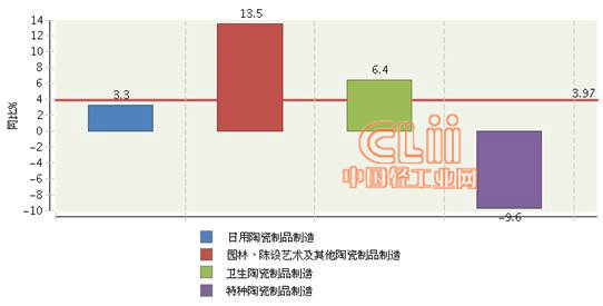 图2-3 2013年1~9月全国陶瓷行业累计出口交货值行业小类同比增长情况