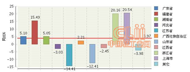 图2-5 2013年1~9月全国陶瓷行业累计出口交货值主要地区同比增长情况
