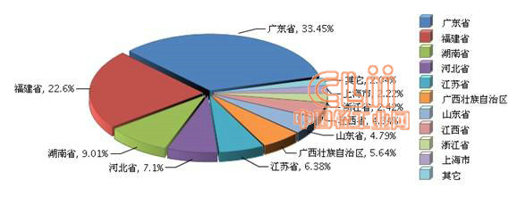 图2-4 2013年1~9月全国陶瓷行业累计出口交货值地区占比情况