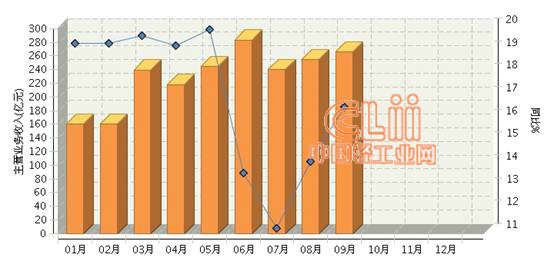 从月度情况看,2013年前5个月同比增速稳定在20%左右;6月份完成主营业务收入为年内单月最高值,而增速回落至13.65%。7月同比增长11.22%,为1~9月最低增速; 8、9月增速逐渐回升;9月份完成主营业务收入仅次于6月份,同比增速回升至16.57%。详见图1。
