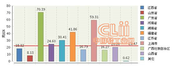 2013年1~9月陶瓷行业完成利润总额前四位的地区依次是江西、山东、广东、河南,其中江西累计完成利润总额同比增长18.32%,占27.81%;山东累计同比增长8.13%,占21.01%。详见图4。