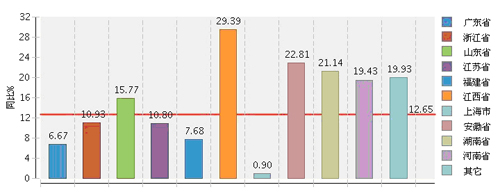2013年1~10月全国文体行业主营业务收入同比增长较快的地区是江西、安徽、湖南、河南、山东地区,分别为29.39%、22.81%、21.14%、19.43%、15.77%。