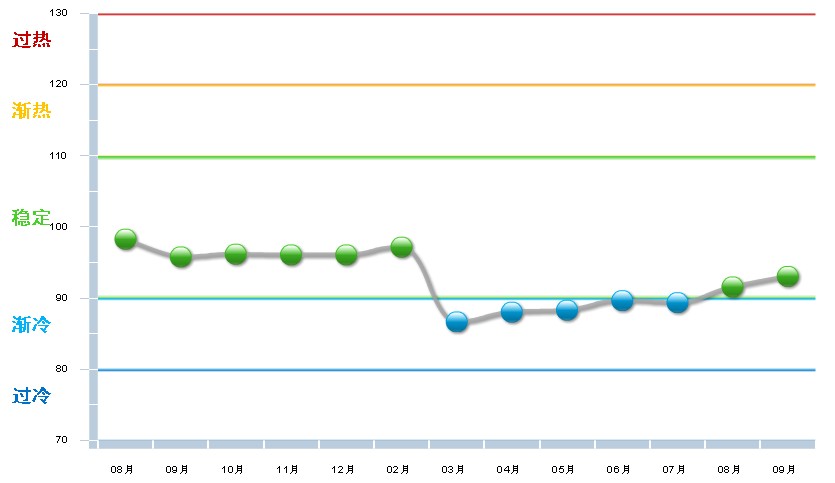 2013年9月与2012年8月相比工艺美术利润景气指数波动较大,2013年3月以后开始回升,8月份进入稳定区域,9月利润景气指数93.07。