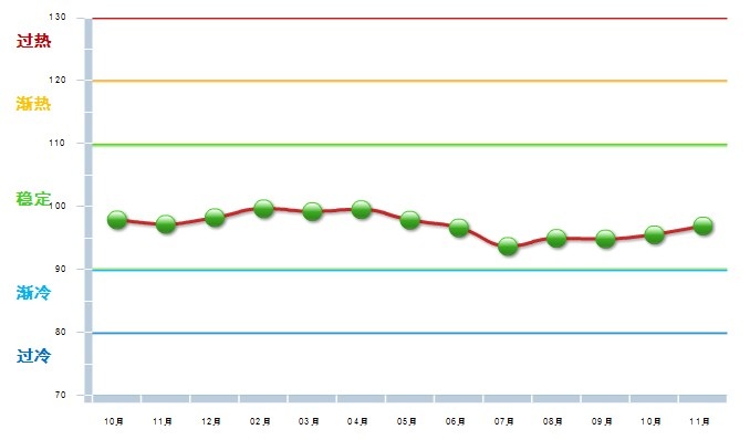 11月,13个省市的日化景气指数位于“稳定”区间,占具有日化指数统计的29个省份(不包括宁夏和青海,下同)的44.8%;位于“过热”区间的省份占17.4%;位于“过冷”区间的省份占24.1%。