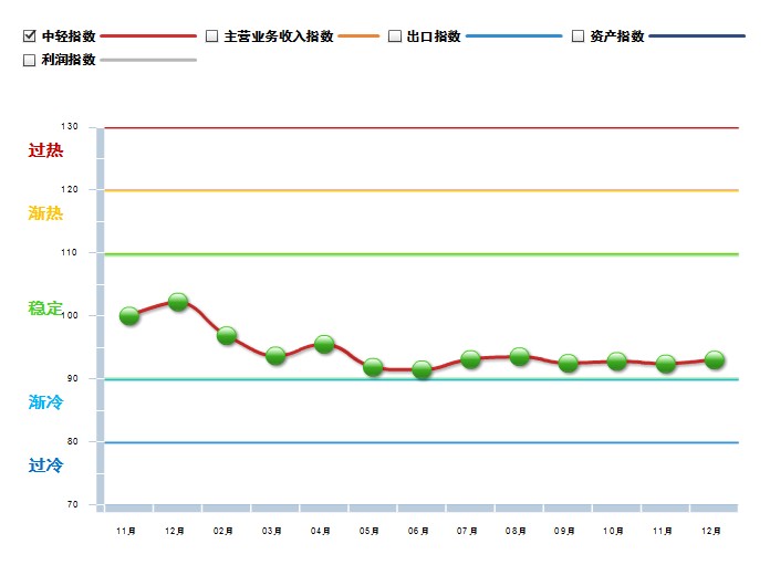 据中国轻工业信息网发布的中轻饮料景气指数显示,2013年1-12月中轻饮料景气指数均处于绿色稳定区间。但从2013年5月开始指数值整体呈现平稳走势。