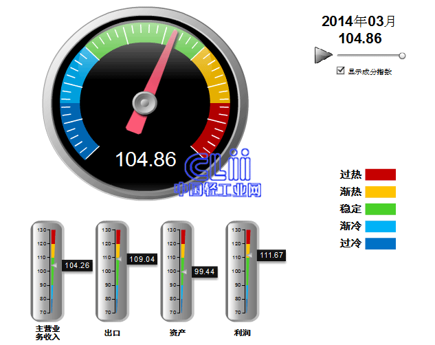 与中国缝制机械协会联合发布2014年3月中轻缝制机械行业景气指数。3月,中轻缝制机械行业景气指数为104.86,其中:主营业务收入景气指数为104.26,出口景气指数为109.04,资产景气指数为99.44,利润景气指数为111.67(图1)。