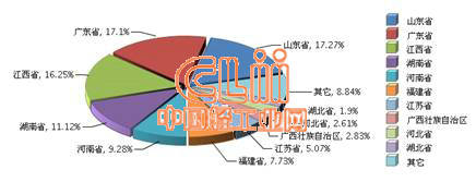 2014年1~5月全国陶瓷行业规模以上企业累计完成主营业务收入前三位地区依然是山东、广东、江西。其中山东累计完成主营业务收入同比增长14.37%,占17.27%;广东累计同比增长20.27%,占17.1%;江西省累计同比增长17.8%,占16.25%,详见图3。