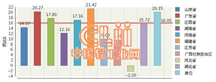图4 2014年1~5月全国陶瓷行业累计主营业务收入主要地区同比增长情况