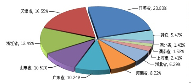 图2 2014年全国自行车行业累计主营业务收入及同比 2014年1-7月份全国自行车行业下辖的两个子行业完成主营业务收入的状况是:脚踏自行车及残疾人座车制造行业累计完成主营业务收入353.84亿元,同比增长5.10%;助动自行车制造行业累计完成主营业务收入402.78亿元,同比增长12.14%。 (三)主营业务收入分地区完成情况 从地区分布上看,自行车行业生产主要集中在江苏省、天津市、浙江省、山东省、广东省等地区,这5省市的比重占全国的74.63%(参见图3)。 图3 2014年1~7月全国自行车行业累计主营业务收入地区占比情况
