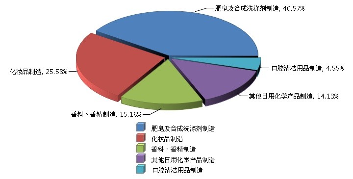 2014年1~8月,肥皂及合成洗涤剂制造完成累计主营业务收入占40.57%;化妆品制造完成累计主营业务收入占25.58%;香料、香精制造完成累计主营业务收入占15.16%;口腔清洁用品制造完成累计主营业务收入占4.55%。