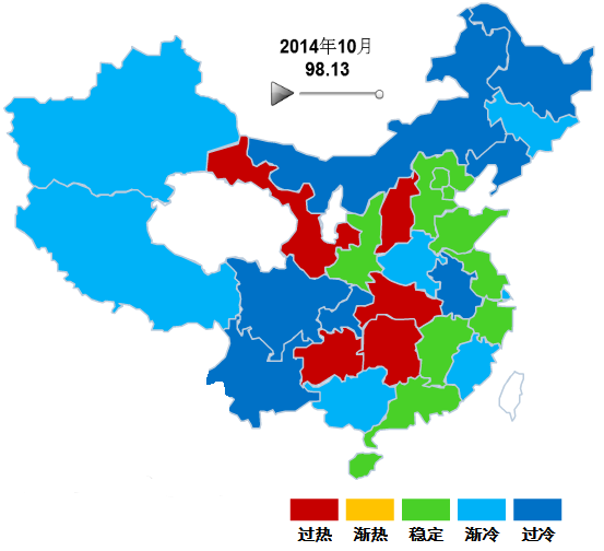 10月,贵州、山西、湖北、甘肃、湖南5省日化景气指数位于“过热”区间,占全国29个统计地区(下同)的17.2%;浙江、广东、天津等等10个地区位于“稳定”区间,占比34.5%;新疆、福建等7省位于“渐冷”区间,占24.1%;辽宁、云南、重庆等7个地区位于“过冷”区间,占24.1%。