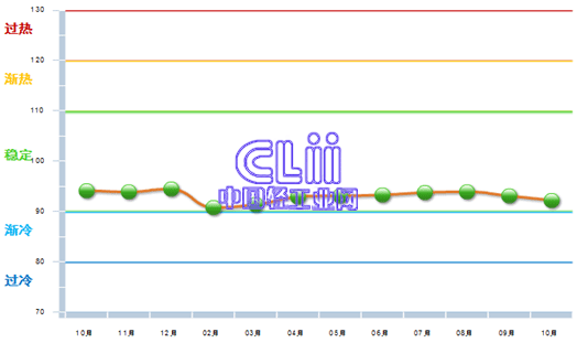 2014年的家具行业主营业务收入景气指数一直处于“稳定”区间的下限附近运行,在结束了6个月连续平缓上升后,9月出现了回落,10月延续下滑走势,10月比9月下降了0.89个百分点(图1)。