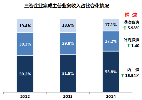 从增长速度看,内资企业从占比及增速居领先其他两类企业;从三年三资企业完成主营业务收入占比变化看,内资企业有份额逐渐扩大趋势,2014年较2012年占比提高5.6个百分点。