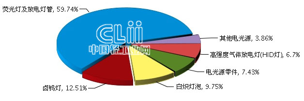 2014年,全国电光源(灯泡)累计出口额64.33亿美元,同比增长-14.40%。其中,荧光灯及放电灯管累计出口额占出口总额的59.74%;卤钨灯累计出口额占出口总额的12.51%;白炽灯泡累计出口额占出口总额的9.75%;电光源零件累计出口额占出口总额的7.43%;高强度气体放电灯(HID灯)累计出口额占出口总额的6.7%;其他电光源累计出口额占出口总额的3.86%。