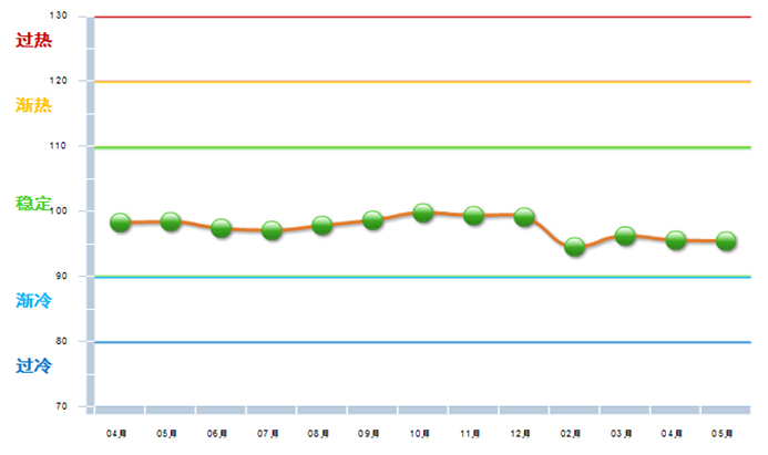 图1 2014.4—2015.5自行车行业主营业务收入景气指数变化态势