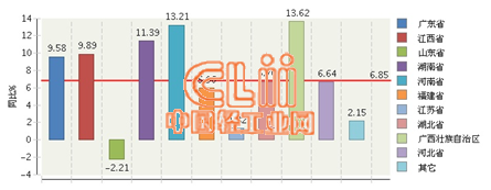 2015年1~5月在全国主要陶瓷产区中,广西、河南、湖南以10%以上增速位居前列,江苏微弱增长,山东负增长,增速居尾,见图2。