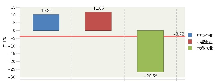 2015年上半年,不同规模企业完成利润占比格局发生改变:由于大型企业利润总额大幅下降26.69%,中型及小型企业盈利规模超过大型企业,其中:中型企业完成累计利润总额占36.43%,同比增长10.31%;小型企业完成累计利润总额占33.78%,同比增长11.86%;大型企业完成累计利润总额占29.79%,同比增长-26.69%。