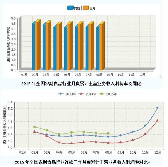 2015年1~8月,全国农副食品行业累计主营业务收入利润率为4.44%,同比增长0.29%。其中:1月~2月份累计主营业务收入利润率为4.63%,同比增长0.13%;1月~3月份累计主营业务收入利润率为4.53%,同比增长0.17%;1月~4月份累计主营业务收入利润率为4.42%,同比增长0.25%;1月~5月份累计主营业务收入利润率为4.46%,同比增长0.34%;1月~6月份累计主营业务收入利润率为4.48%,同比增长0.3%;1月~7月份累计主营业务收入利润率为4.45%,同比增长0.28%;1月~8月份累计主营业务收入利润率为4.44%,同比增长0.29%。