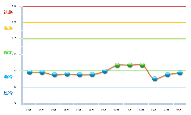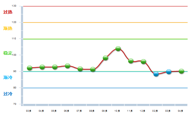 2014年3月至2014年8月中轻工艺美术景气指数处于基本稳定状态。2014年8月份中轻工艺美术景气指数开始出现较大幅度上升,自10月开始出现较大幅度下降,到15年2月已降至渐冷区域,4月份回归稳定区域。(参见图2)