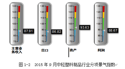 2015年9月,塑料制品行业除资产景气指数外,主营业务、利润、出口指数均继续处在渐冷区间。