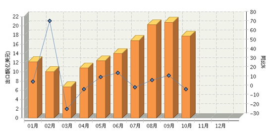 2015年1月~10月,全国玩具行业累计完成出口额141.85亿美元,同比增长10.27%。其中,10月份完成出口额17.74亿美元,同比增长1.44%,增速较9月份下降了14.77个百分点,较去年同期下降了4.49个百分点。