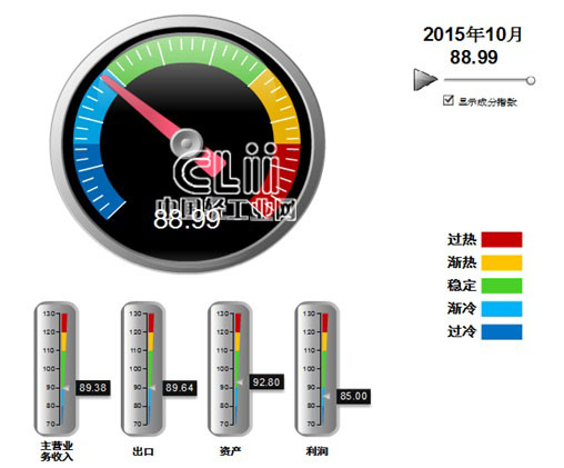 发布2015年10月中轻照明景气指数。10月,中轻照明景气指数88.99,其中:主营业务收入景气指数为89.38,出口景气指数为89.64,资产景气指数为92.80,利润景气指数为85.00(图1)。