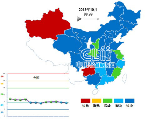 2015年10月,处于“稳定”区间的地区有3个,分别是陕西、江苏、福建。比上个月少两个。处于“过热”区间的地区有2个:贵州和新疆,占全国的6.45%。处于“渐冷”区间的地区有3个,分别是:湖南、广东和浙江。其它地区均处于过冷状态(不含西藏、云南、宁夏、海南),过冷地区范围(图3)。