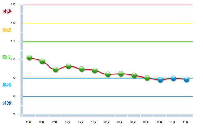 图1 2015.12自行车行业景气指数分指标显示状况 2015年以来,自行车行业受国内外经济环境影响,景气指数逐月走低,全年呈下滑走势,在7月份略有回升后,第四季度起步入渐冷区间(参见图2)。 图2 2014.11—2015.12自行车行业景气指数变化态势