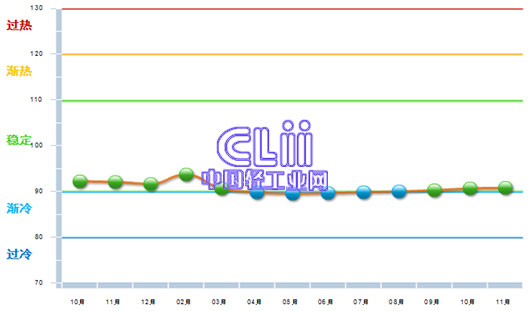 图1 2014年10月~2015年11月家具行业主营业务收入景气指数变化态势
