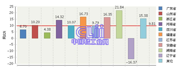 同期,前十位地区中,只有湖南的累计主营业务收入保持了21%以上的快速增长(下称“累计增速”);福建和安徽2个地区的累计增速超过了16%;河南、山东及四川3个地区的累计增速超过了10%;江苏、广东及浙江3个地区的增速低于全国家具行业平均水平;辽宁继续负增长,且累计增速降为-16.37%(图7)。