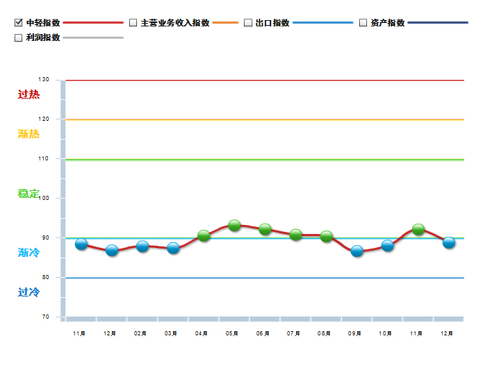 从轻工业行业运行监测预警系统上看,饮料工业运行的综合景气指数显示:饮料行业从去年运行渐冷状态,逐月回升到今年4月份,进入稳定区间后,基本在偏冷和平稳区间波动,年底景气指数在渐冷区间徘徊。4个分项景气指数上,除出口景气指数异常外,主营业务收入、资产、利润景气指数都处于稳定渐冷的状态。