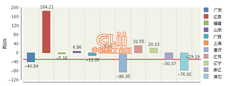 从出口增速看,2016年一季度我国陶瓷砖出口主要地区中,江西、江苏、辽宁出口额同比增速居前,其中江西出口额同比增长184.21%,占比较上年同期提高了13.68个百分点,由第三升至第二;重庆、广东、浙江、广西、福建出口额同比下降,其中重庆降幅居首,同比下降了86.35%。2016年1~3月我国陶瓷砖出口额地区占比、同比情况详见图1、2。