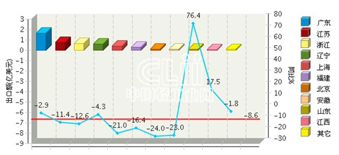 从出口地区来看,广东、江苏、浙江是出口日本的三大省份。其中:广东完成累计出口额1.67亿美元(占34.16%),同比增长-2.9%;江苏完成累计出口额0.75亿美元(占15.36%),同比增长-11.4%;浙江完成累计出口额0.66亿美元(占13.58%),同比增长-12.6%。