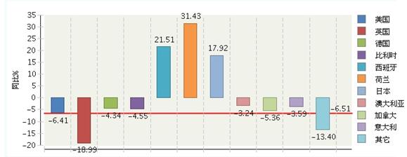 就增速来看,江苏玩具行业除对荷兰、西班牙、日本的出口增长态势较好外,对其他国家和地区都出现负增长态势,尤其是对英国出口同比下降18.99%。