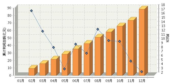 2016年1月~12月,全国自行车制造行业累计完成利润总额88.13亿元,同比增长2.87%,增速低于11月份2.52个百分点。(参见图2)。