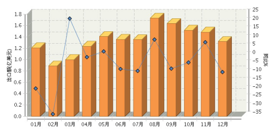 图:2016年1-12月全国乐器行业月度出口额月度走势