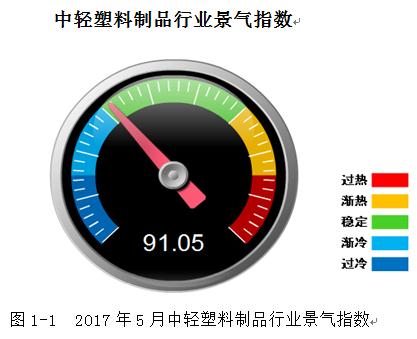 中国轻工业经济运行及预测预警系统监测显示:2017年5月份中轻塑料景气指数为91.05,比4月份回升0.38点。目前,塑料景气指数处于绿色稳定区间运行。