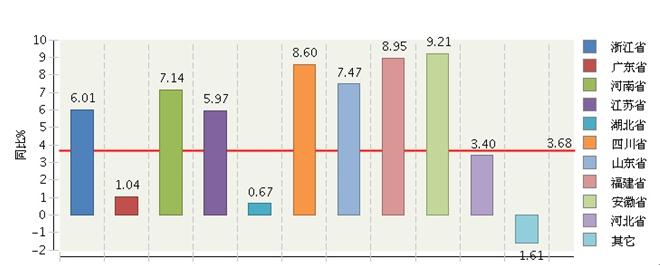 主要产区中:广东、湖北省1-7月产量增速比上月虽有回升,但仍低于全国平均水平,其中:广东省产量增速为1.04%,湖北产量增速仅为0.67%。