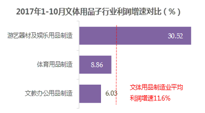 从三个子行业1-10月完成利润情况看,文教办公用品制造累计完成利润总额占42.8%;体育用品制造占35.5%;游艺器材及娱乐用品制造占21.7%。
