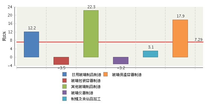 其中,日用玻璃制品制造占30.4%,同比增长12.17%;玻璃包装容器制造占29.86%,同比增长-3.47%;其他玻璃制品制造占24.51%,同比增长22.3%;玻璃仪器制造占9.32%,同比增长-3.25%;制镜及类似品加工占3.97%,同比增长3.08%;玻璃保温容器制造占1.94%,同比增长17.87%。