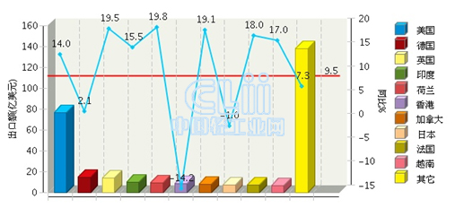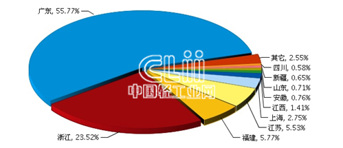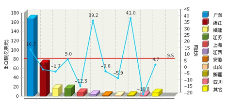 从出口省市来看,比重主要集中在广东、浙江、福建、江苏、上海等地区。其中:广东完成累计出口额167.29亿美元(占55.77%),同比增长16.68%。