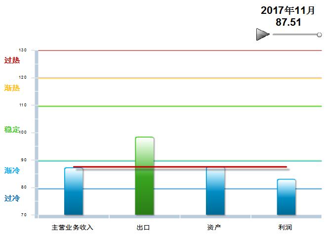 2016年10月至2017年11月,中轻皮革景气指数基本稳定,在90附近小幅波动,处于渐冷提示区运行(参见图3)。