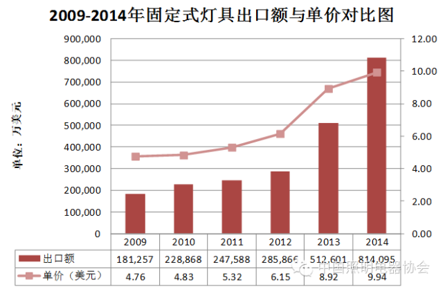 表10 中国固定式灯具出口额与单价(2009-2014年)